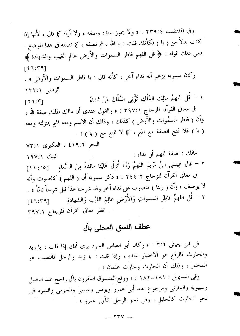 في معاني القرآن للزجاج 397:1: «والقول عندي أن مالك الملك صفة الله، وأن (فاطر السموات والأرض) كذلك، وذلك أن الاسم ومعه الميم بمنزلته ومعه (يا) فلا تمنع الصفة مع الميم، كما لا تمنع (يا)».