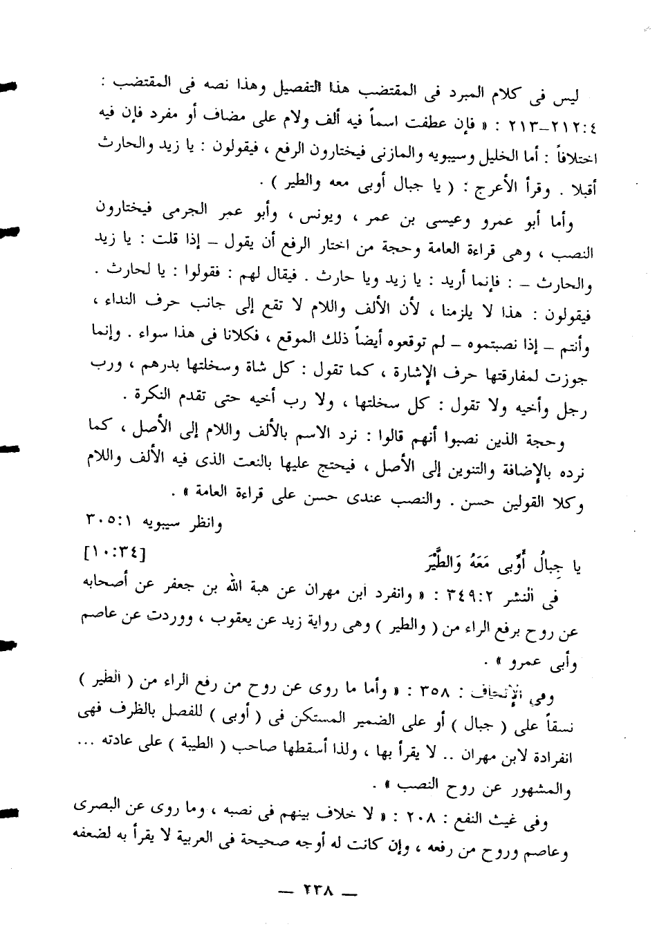 ليس في كلام المبرد في المقتضب هذا التفصيل وهذا نصه في المقتضب: 212:4 - 213: «فإن عطفت اسمًا فيه ألف ولام على مضاف أو مفرد فإنه فيه اختلافا: أما الخليل وسيبويه والمازني فيختارون الرفع، فيقولون: يا زيد والحارث أقبلا. وقرأ الأعرج: (يَا جِبَالُ أَوِّبِي مَعَهُ وَالطَّيْرَ).