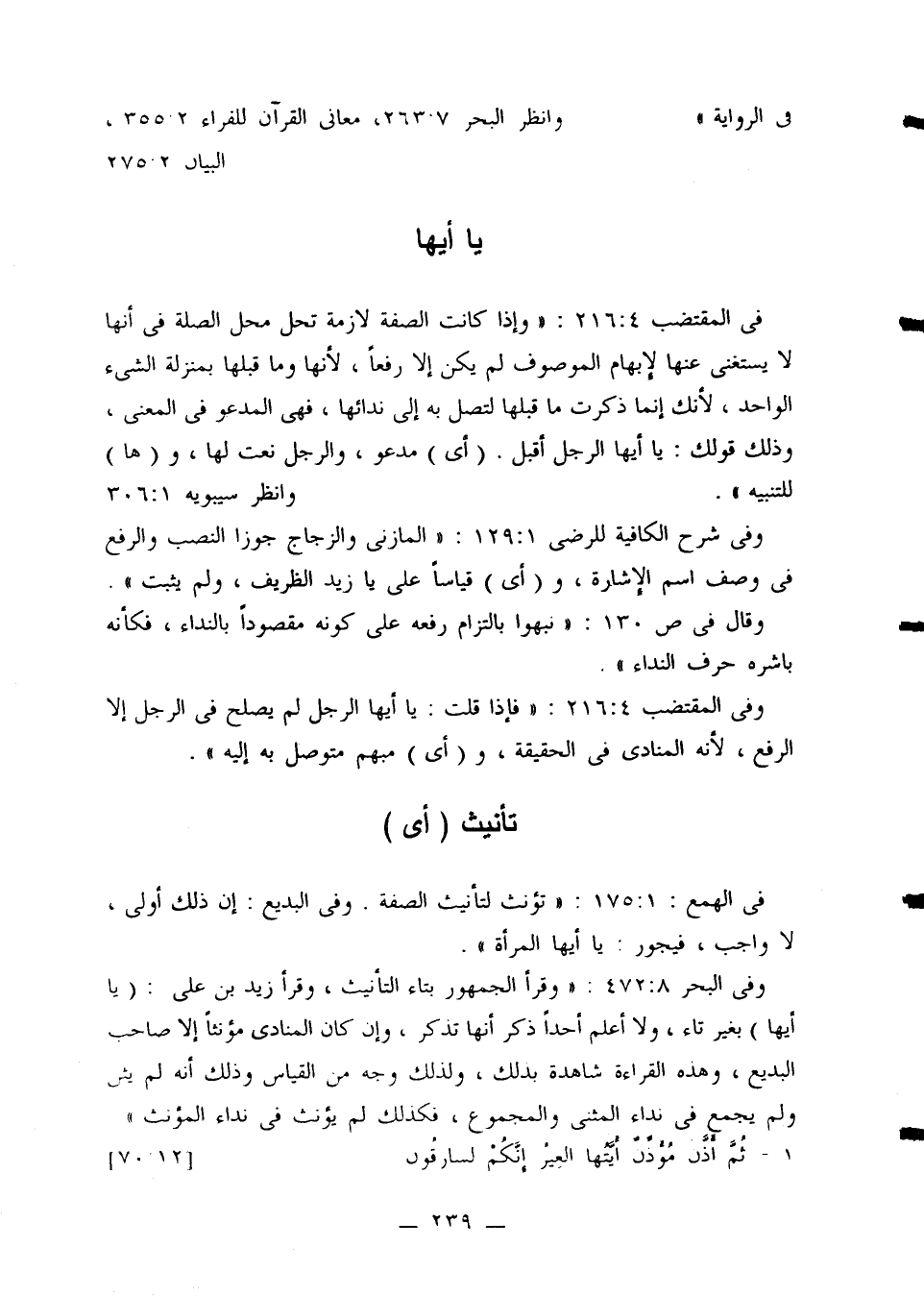 وفي المقتضب 216:4: «فإذا قلت: يا أيها الرجل لم يصلح في الرجل إلا الرفع، لأنه المنادى في الحقيقة، و (أي) مبهم متوصل به إليه».