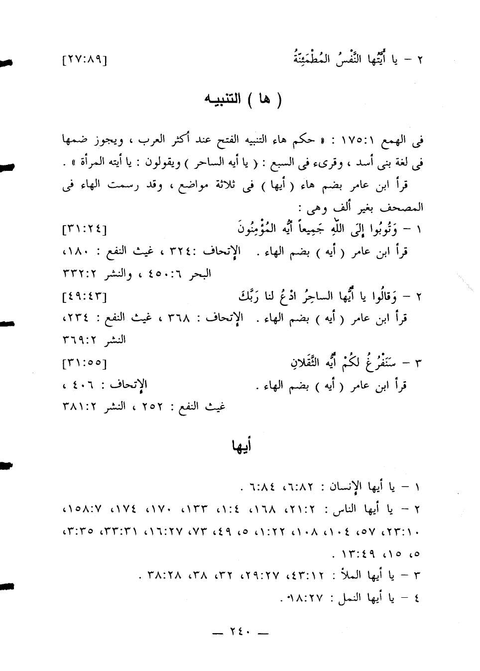 وفي الهمع 175:1: «حكم هاء التنبيه الفتح عند أكثر العرب، وجوز ضمها في لغة بني أسد، وقرئ في السبع: (يا أيه الساحر) ويقولون: يا أيته المرأة».