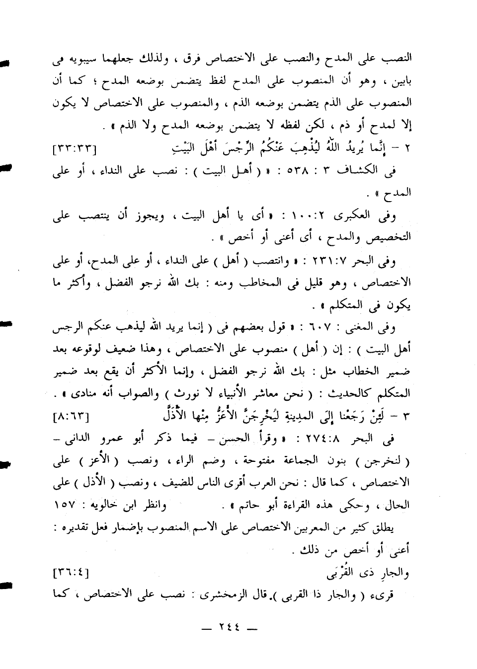 وفي المغني 607: «قول بعضهم في (إنما يريد الله ليذهب عنكم الرجس أهل البيت). إن (أهل) منصوب على الاختصاص. وهذا ضعيف لوقوعه بعد ضمير الخطاب مثل: يك الله نرجو الفضل. وإنما الأكثر أن يقع بعد ضمير المتكلم كالحديث: (نحن معاشر الأنبياء لا نورث) والصواب أنه منادى».