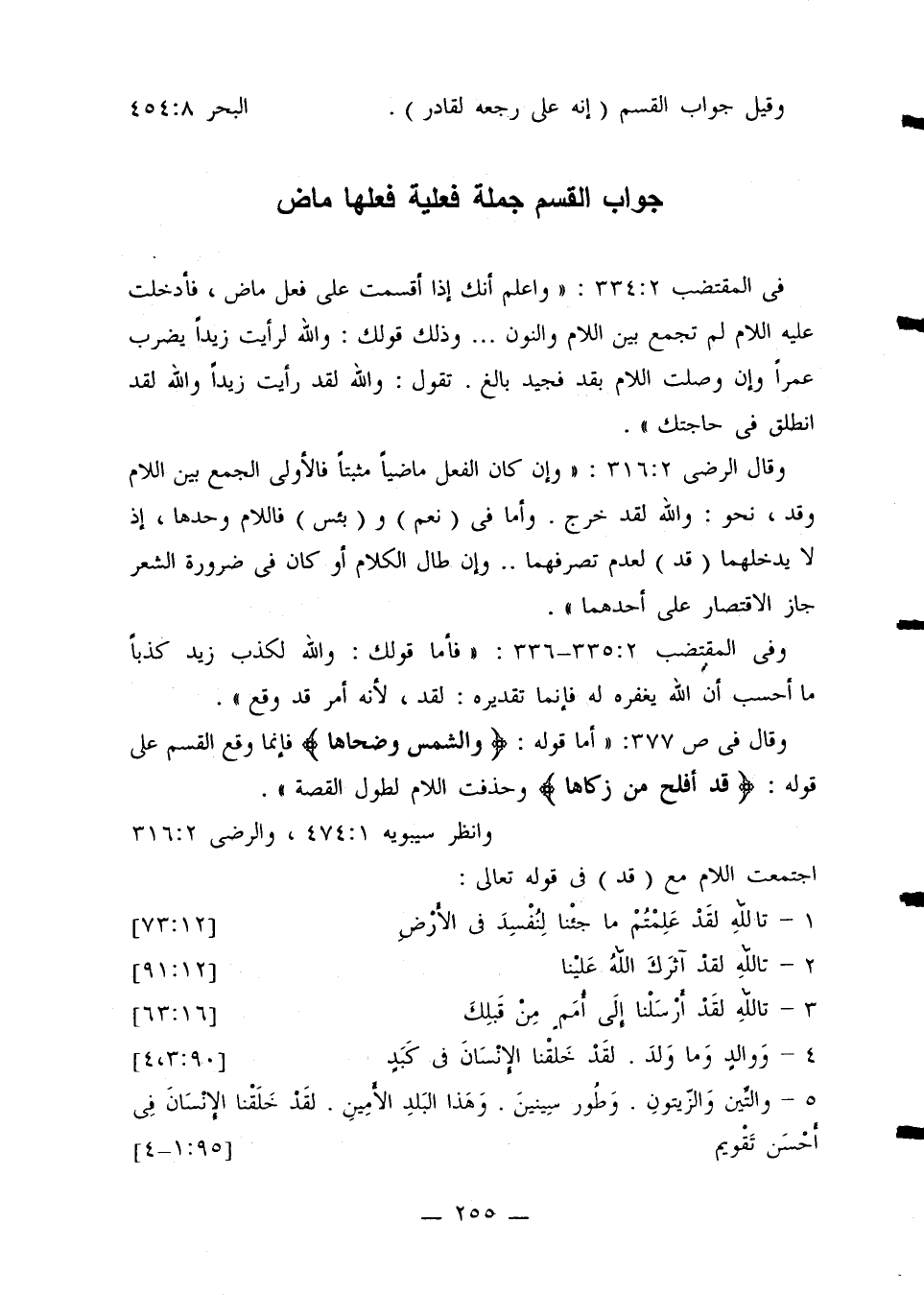 في المقتضب 334:2: «واعلم أنك إذا أقسمت على فعل ماض، فأدخلت عليه اللام لم تجمع بين اللام والنون ... وذلك قولك لرأيت زيداً يضرب عمراً وإن وصلت اللام بقد فجيد بالغ. تقول: والله لقد رأيت زيداً والله لقد انطلق في حاجتك».