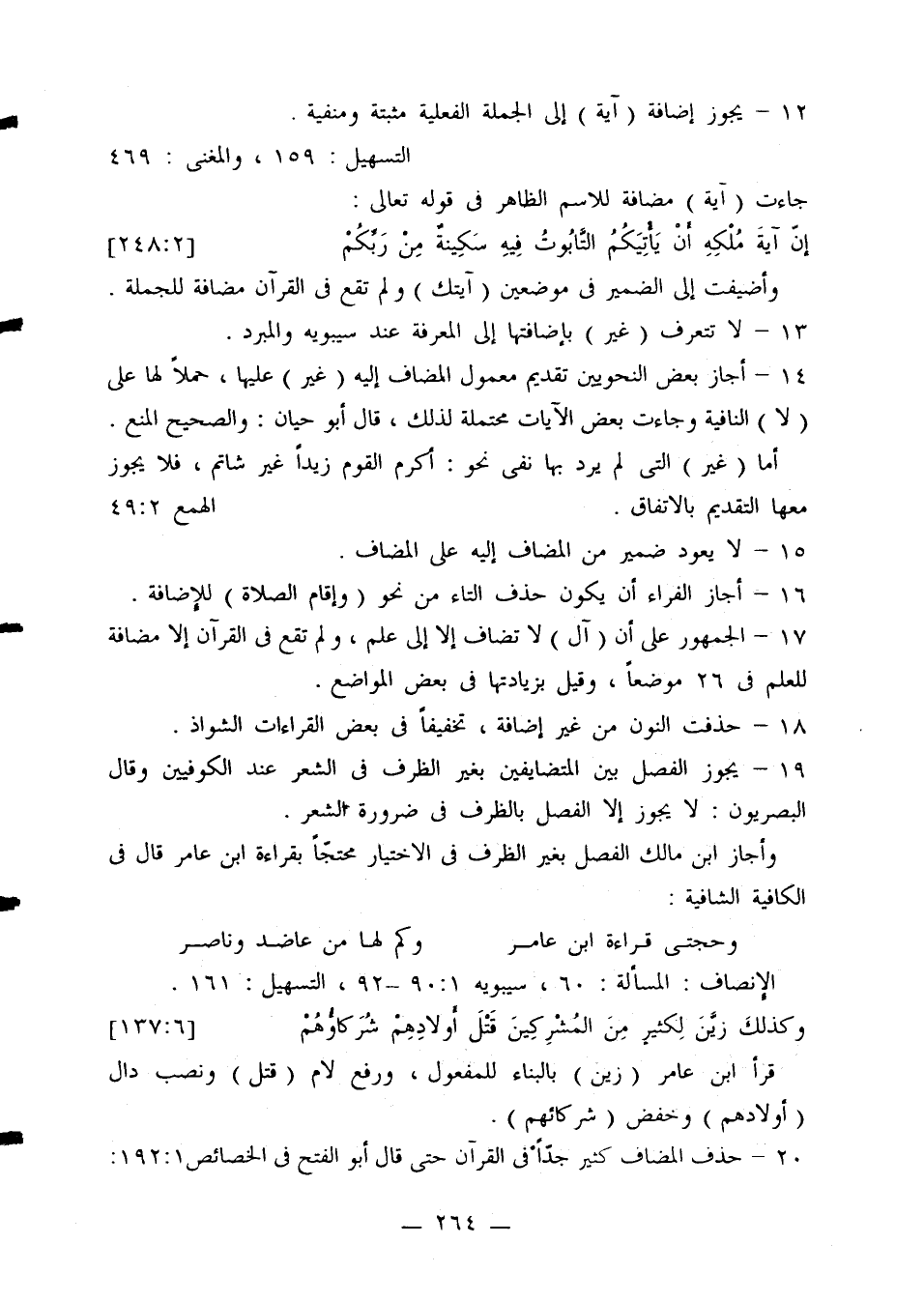 14 - أجاز بعض النحويين تقديم معمول المضاف إليه 0 غير) عليها، حملاً لهما على (لا) النافية وجاءت بعض الآيات محتملة لذلك، قال أبو حيان: والصحيح المنع.