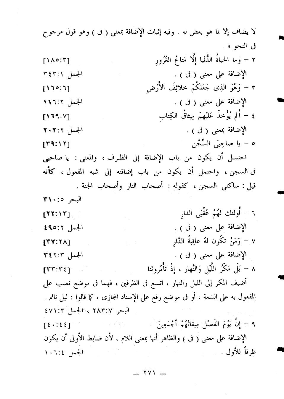 الإضافة على معنى (في) والظاهر أنها بمعنى اللام، لأن ضابط الأولى أن يكون ظرفاً للأول. الجمل 106:4