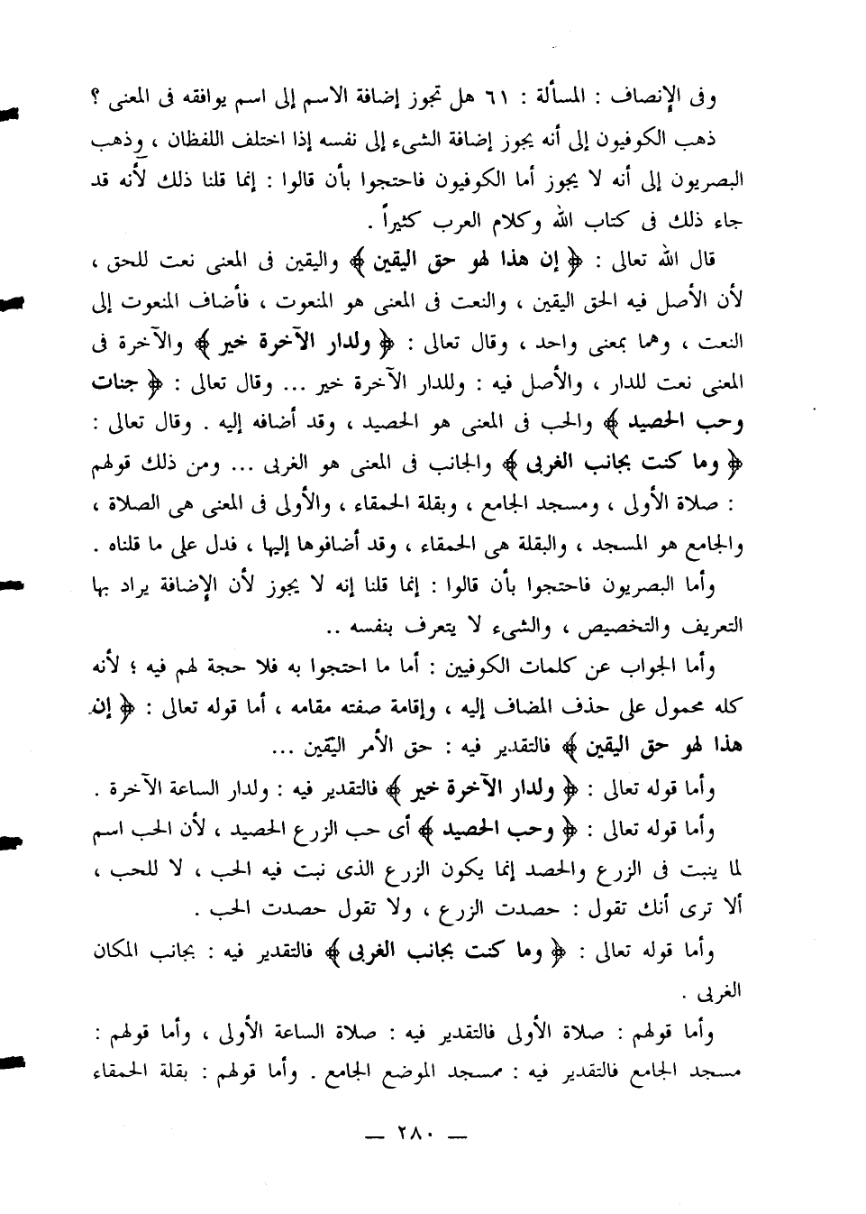 وفي الإنصاف: المسألة: 61 هل تجوز إضافة الاسم إلى اسم يوافقه في المعنى؟ ذهب الكوفيون إلى أنه يجوز إضافة الشيء إلى نفسه إذا اختلف اللفظان، وذهب البصريون إلى أنه لا يجوز أما الكوفيون فاحتجوا بأن قالوا: إنما قلنا ذلك لأنه قد جاء ذلك في كتاب الله وكلام العرب كثيراً.