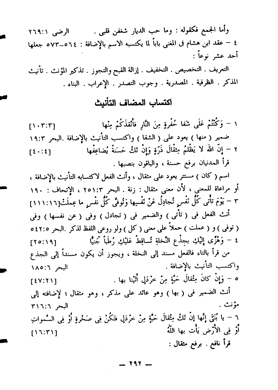 4 - عقد ابن هشام في المغنى باباً لما يكتسبه الاسم بالإضافة: 564 - 573 جعلها أحد عشر نوعاً: