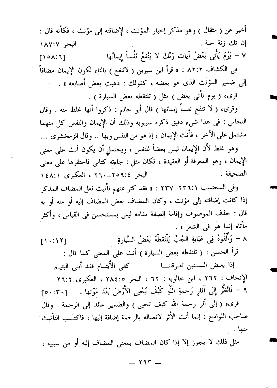 في الكشاف 82:2: «قرأ ابن سيرين (لا ينفع) بالتاء لكون الإيمان مضافاً إلى ضمير المؤنث الذي هو بعضه، كقولك: ذهبت بعض أصابعه».