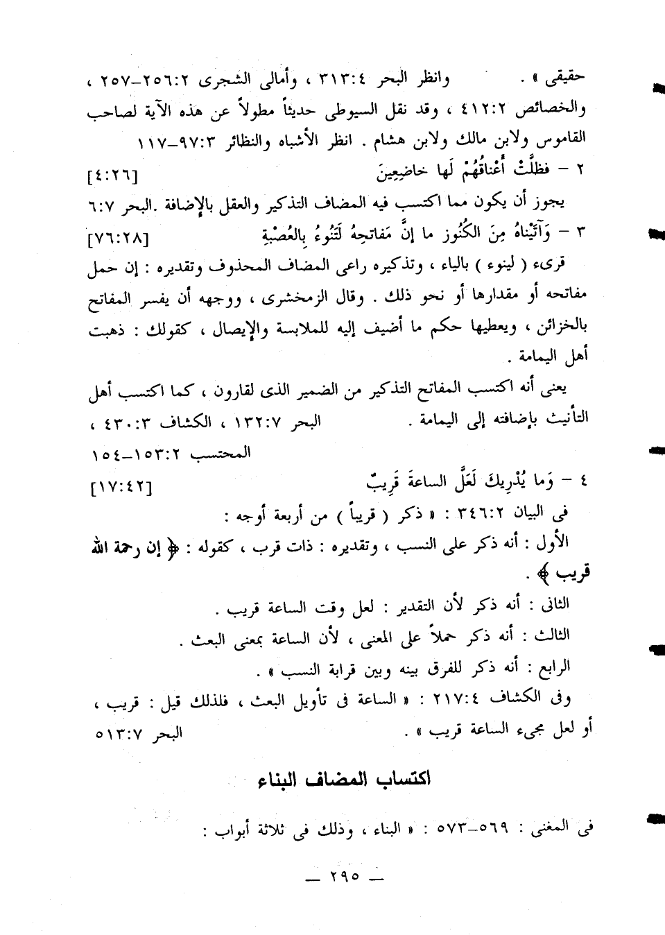 حقيقي». وانظر البحر 313:4، وأمالي الشجري 256:2 - 257، والخصائص 412:2، وقد نقل السيوطي حديثًا مطولاً عن هذه الآية لصاحب القاموس ولابن مالك ولابن هشام. انظر الأشباه والنظائر 97:3 - 117