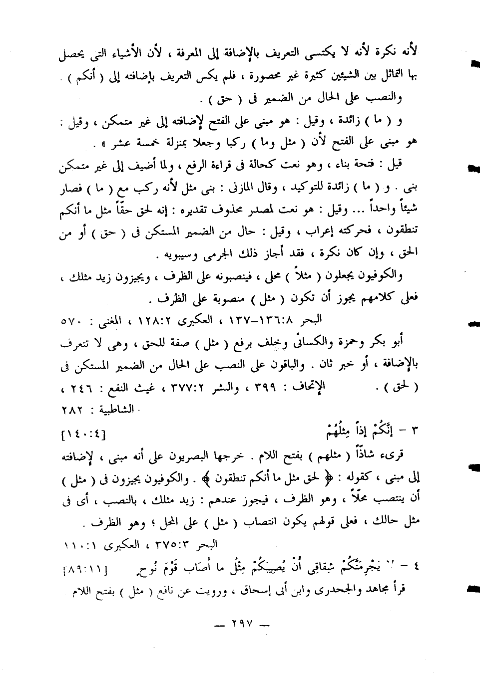 قرئ شاذًا (مثلهم) بفتح اللام. خرجها البصريون على أنه بمني، لإضافته إلى مبنى، كقوله: {لحق مثل ما أنكم تنطقون}. والكوفيون يجيزون في (مثل) أن ينتصب محلاً، وهو الظرف، فيجوز عندهم: زيد مثلك، بالنصب، أي في مثل حالك، فعلى قولهم يكون انتصاب (مثل) على المحل؛ وهو الظرف.