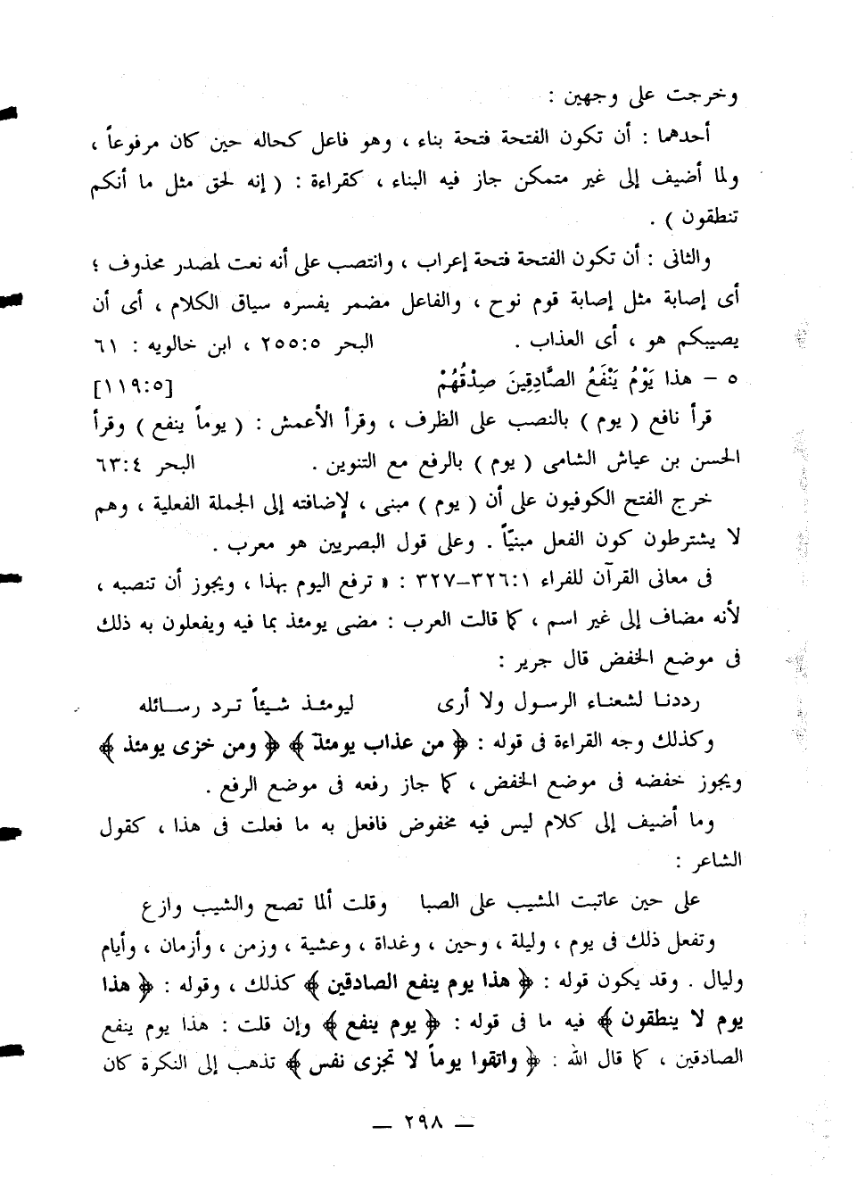 في معاني القرآن للفراء 326:1 - 327: «ترفع اليوم بهذا، ويجوز أن تنصبه، لأنه مضاف إلى غير اسم، كما قالت العرب: مضى يومئذ بما فيه ويفعلون به ذلك في موضع الخفض قال جرير: