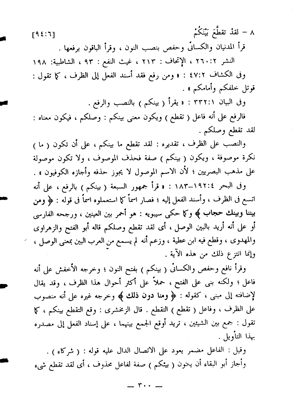 وفي البحر 192:4 - 183: «قرأ جمهور السبعة (بينكم) بالرفع، على أنه اتسع في الظرف، وأسند الفعل إليه؛ فصار اسمًا كما استعملوه اسمًا في قوله: {ومن بيننا وبينك حجاب} وكما حكى سيبويه: هو أحمر بين العينين، ورجحه الفارسي أو على أنه أريد بالبين الوصل، أي لقد تقطع وصلكم قاله أبو الفتح والزهراوي والمهدوي، وقطع فيه ابن عطية، وزعم أنه لم يسمع من العرب البين بمعنى الوصل، وإنما انتزع ذلك من هذه الآية.
