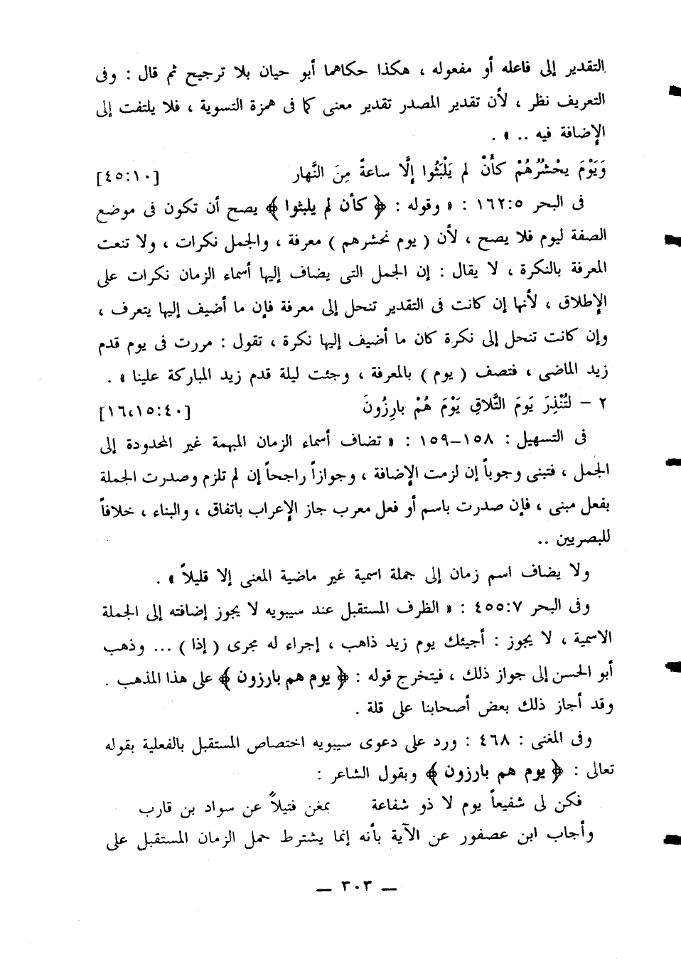 في البحر 162:5: «وقوله. {كأن لم يلبثوا} يصح أن تكون في موضع الصفة ليوم فلا يصح، لأن (يوم تحشرهم) معرفة، والجمل نكرات، ولا تنعت المعرفة بالنكرة، لا يقال: إن الجمل التي يضاف إليها أسماء الزمان نكرات على الإطلاق، لأنها إن كانت في التقدير تنحل إلى معرفة فإن ما أضيف إليها بتعرف، وإن كانت تنحل إلى نكرة كان ما أضيف إليها نكرة، تقول: مررت في يوم قدم زيد الماضي، فتصف (يوم) بالمعرفة، وجئت ليلة قدم زيد المباركة علينا».