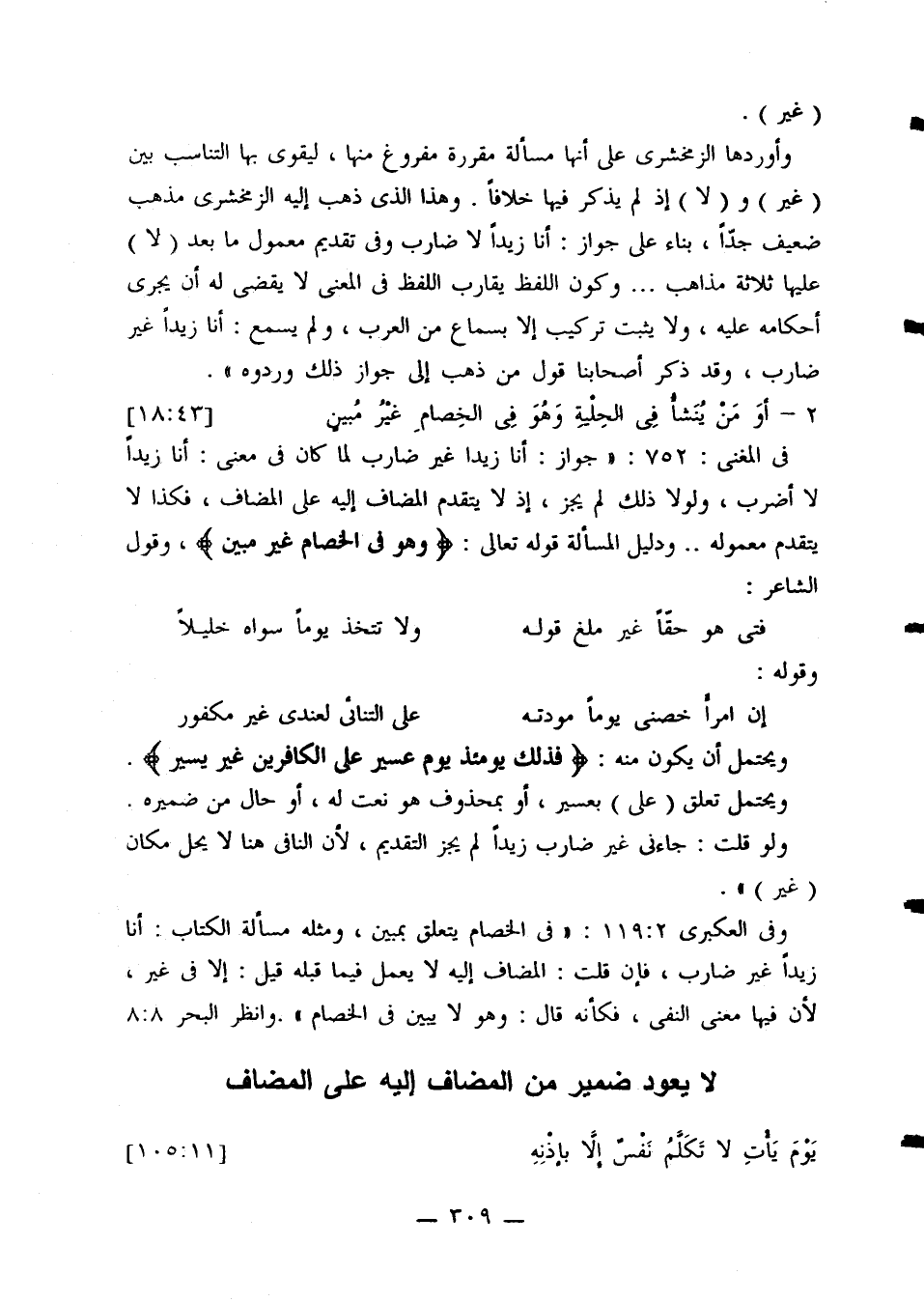 في المغني: 752: «جواز: أنا زيدًا غير ضارب لما كان في معنى: أنا زيدًا لا أضرب، وللا ذلك لم يجز، إذ لا يتقدم المضاف إليه على المضاف، فكذا لا يتقدم معموله .. ودليل المسألة قوله تعالى: {وهو في الخصام غير مبين}، وقول الشاعر: