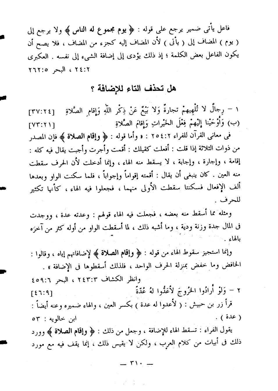 في معاني القرآن للفراء 254:2: «وأما قوله: {وإقام الصلاة} فإن المصدر من ذوات الثلاثة إذا قلت: أفعلت كقيلك: أقمت وأجرت وأجبت يقال فيه كله: إقامة، وإجارة، وإجابة، لا يسقط منه الهاء، وإنما أدخلت لأن الحرف سقطت منه العين. كانينبغي أن يقال: أقمته إقوامًا وإجوابًا، فلما سكنت الواو وبعدها ألف الإفعال فسكنتا سقطت الأولى منهما، فجعلوا فيه الهاء، كأنها تكثير للحرف.