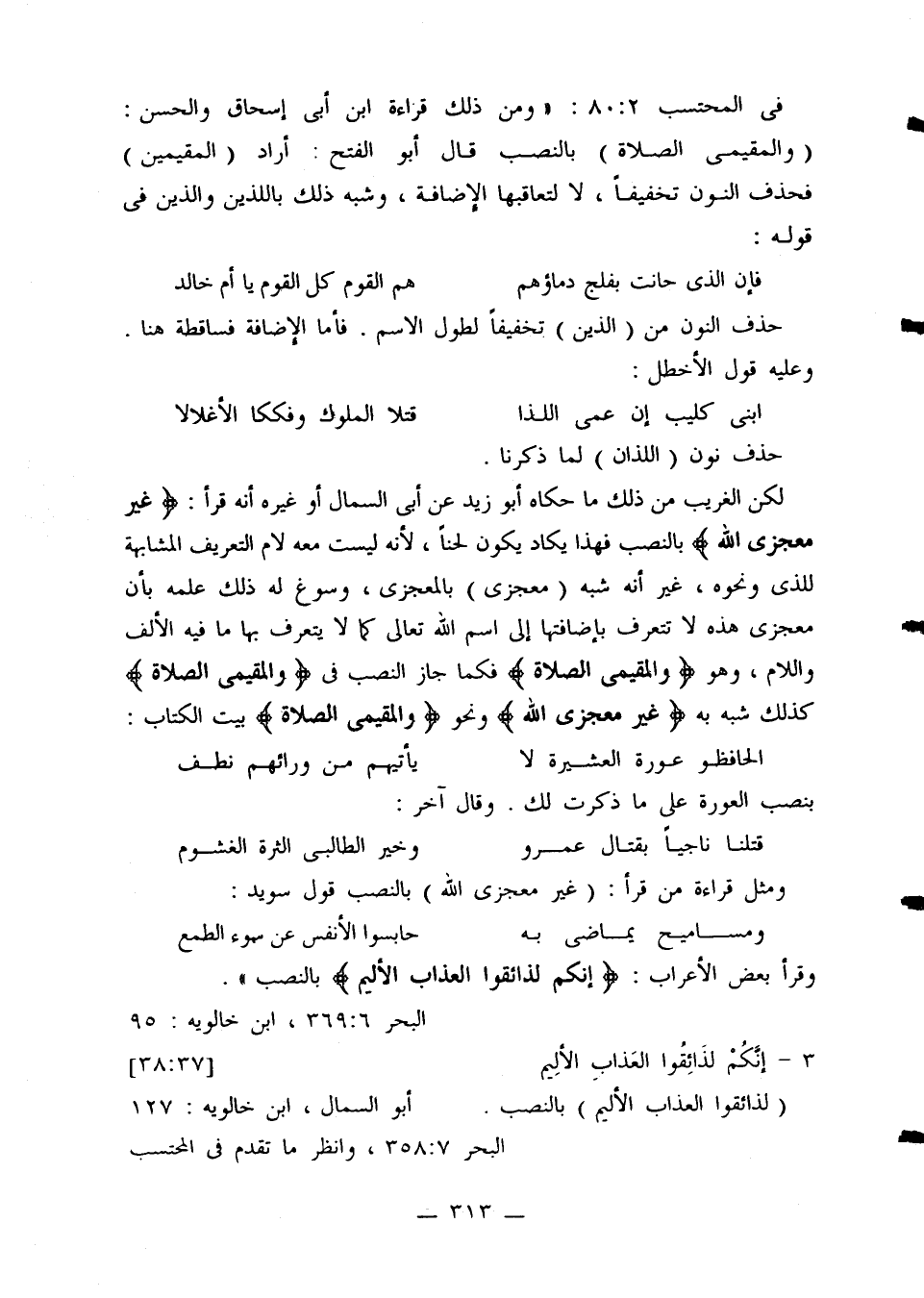 في المحتسب 80:2: «ومن ذلك قراءة ابن أبي إسحاق والحسن: (والمقيمي الصلاة) بالنصب قال أبو الفتح: أراد (المقيمين) فحذف النون تخفيفًا، لا لتعاقبها الإضافة، وشبه ذلك باللذين والذين في وله: