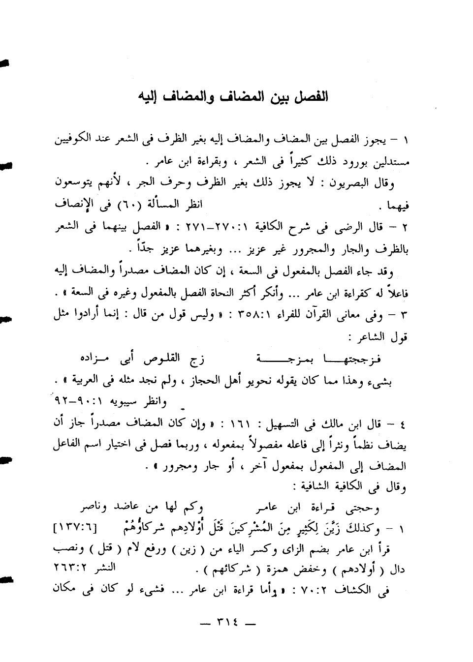 4 - قال ابن مالك في التسهيل: 161: «وإن كان المضاف مصدرًا جاز أن يضاف نظمًا ونثرًا إلى فاعله مفصولاً بمفعوله، وربما فصل في اختيار اسم الفاعل المضاف إلى المفعول بمفعول آخر، أو جار ومجرور».