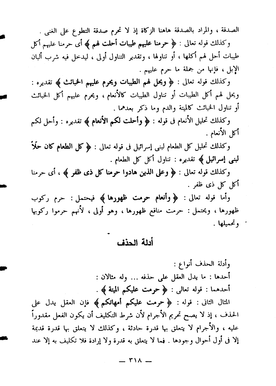 المثال الثاني: قوله: {حرمت عليكم أمهاتكم} فإن العقل يدل على الحذف، إذ لا يصح تحريم الأجرام لأن شرط التكليف أن يكون الفعل مقدورًا عليه، والأجرام لا يتعلق بها قدرة حادثة، وكذلك لا يتعلق بها قدرة قديمة إلا في أول أحوال وجودها. فما لا يتعلق به قدرة ولا إرادة فلا تكليف به إلا عند