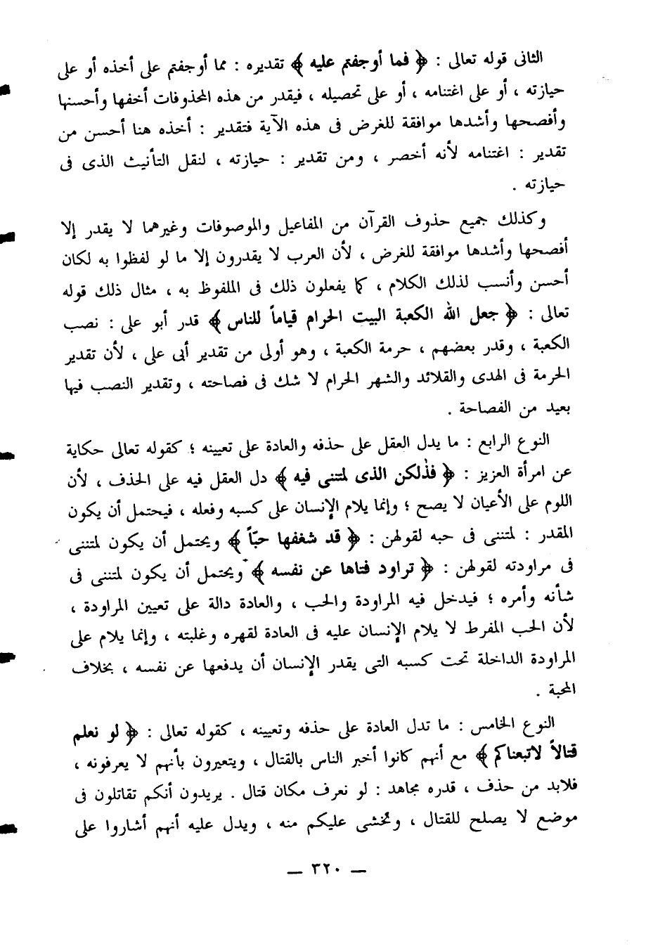 وكذلك جميع حذوف القرآن من المفاعيل والموصوفات وغيرهما لا يقدر إلا أفصحها وأشدها موافقة للغرض، لأن العرب لا يقدرون إلا ما لو لفظوا به لكان أحسن وأنسب لذلك الكلام، كما يفعلون ذلك في الملفوظ به، مثال ذلك قوله تعالى: {جعل الله الكعبة البيت الحرام قيامًا للناس} قدر أبو علي: نصب الكعبة، وقدر بعضهم، حرمة الكعبة، وهو أولى من تقدير أبي علي، لأن تقدير الحرمة في الهدى والقلائد والشهر الحرام لا شك في فصاحته، وتقدير النصب فيها بعيد من الفصاحة.