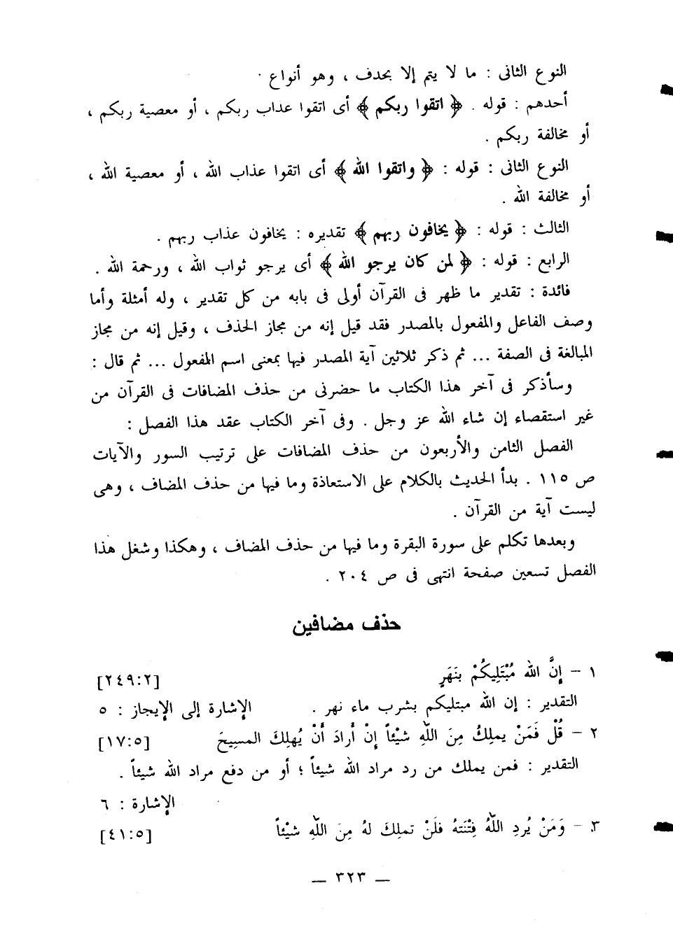 وبعدها تكلم على سورة البقرة وما فيها من حذف المضاف، وهكذا وشغل هذا الفصل تسعين صفحة انتهى في ص 204.