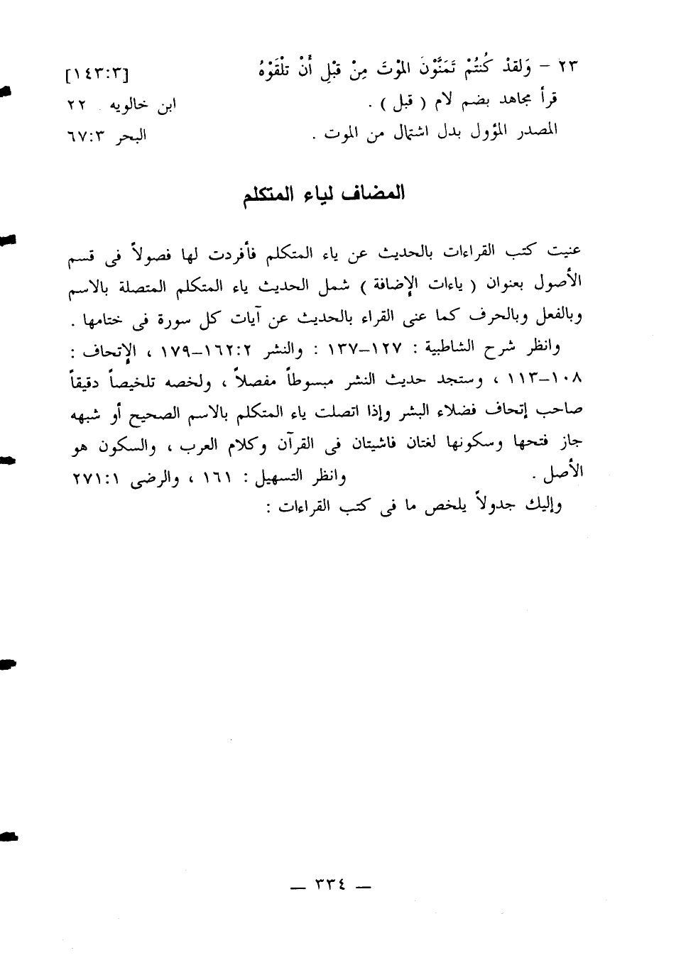 وانظر شرح الشاطبية: 127 - 137: والنشر 162: 2 - 179، الإتحاف: صاحب إتحاف فضلاء البشر وإذا اتصلت ياء المتكلم بالاسم الصحيح أو شبهه جاز فتحها وسكونها لغتان فاشيتان في القرآن وكلام العرب، والسكون هو الأصل. وانظر التسهيل: 161، والرضي 271: 1
