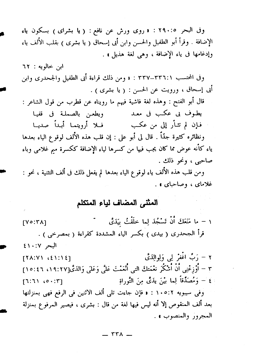 وفي البحر 29:5: «روى ورش عن نافع: (يا بشرى) بسكون ياء الإضافة. وقرأ أبو الطفيل والحسن وابن أبي إسحاق (يا بشرى) بقلب الألف ياء وإدغامها في ياء الإضافة، وهي لغة هذيل».