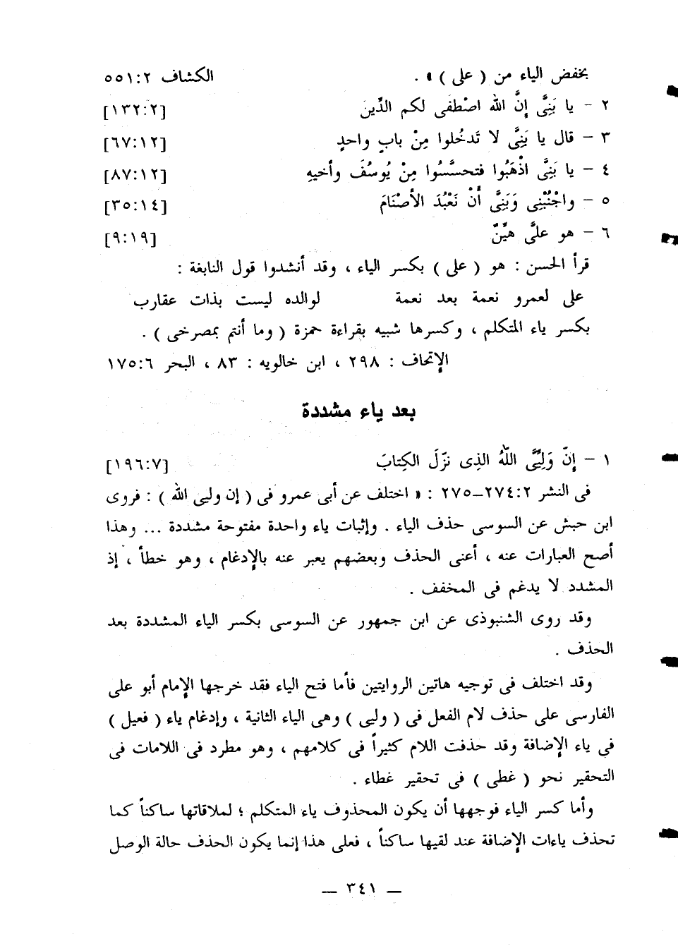 في النشر 274:- 275: «اختلف عن أبي عمرو في (إن وليي الله): فروى ابن حبش عن السوسي حذف الياء. وإثبات ياء واحدة مفتوحة مشددة ... وهذا أصح العبارات عنه، أعني الحذف وبعضهم يعبر عنه بالإدغام، وهو خطأ، إذ المشدد لا يدغم في المخفف.
