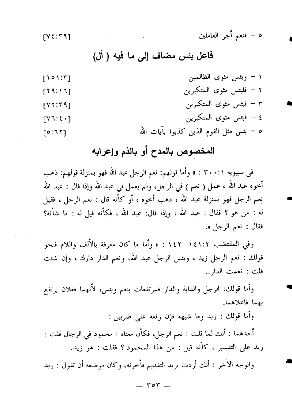 وفي المقتضب 141:2 - 142: «وأما ما كان معرفة بالألف واللام فنحو قولك: نعم الرجل زيد، بئس الرجل عبد الله، ونعم الدار دارك، وإن شئت قلت: نعمت الدار ..
