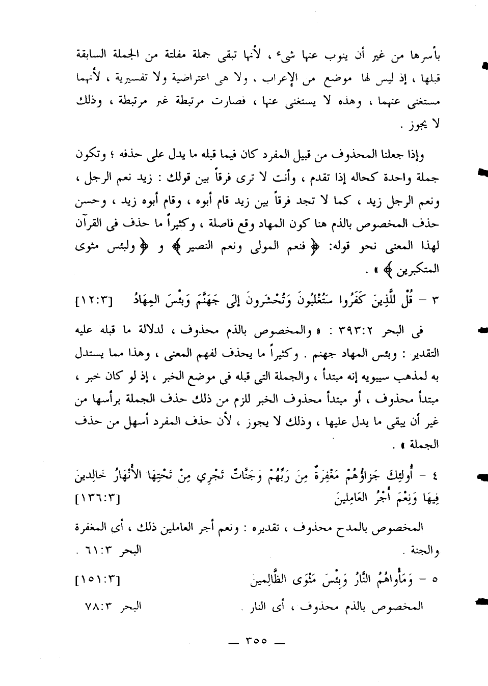 وإذا جعلنا المحذوف من قبيل المفرد كان فيما قبله ما يدل على حذفه؛ وتكون جملة واحدة كحاله إذا تقدم، وأنت لا ترى فرقًا بين قولك: زيد نعم الرجل، ونعم الرجل زيد، كما لا تجد فرقًا بين زيد قام أبوه، وقام أبوه زيد، وحسن حذف المخصوص بالذم هنا كون المهاد وقع فاصلة، وكثيرًا ما حذف في القرآن لهذا المعنى نحو قوله: {فنعم المولى ونعم النصير} و {ولبئس مثوى المتكبرين}».