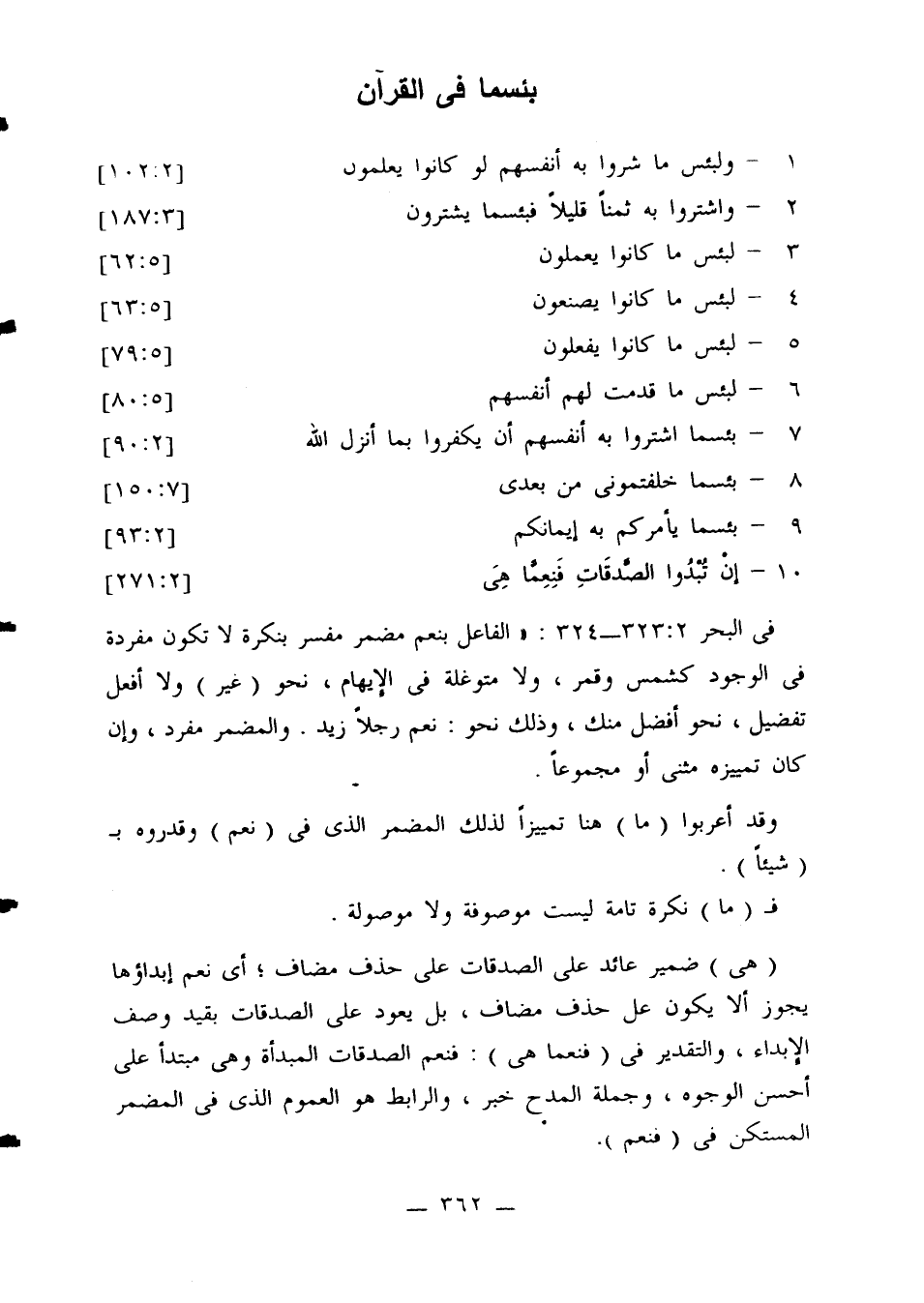 في البحر 323:2 - 324: «الفاعل بنعم مضمر مفسر بنكرة لا تكون مفردة في الوجود كشمس وقمر، ولا متوغلة في الإيهام، نحو (غير) ولا أفعل تفضيل، نحو أفضل منك، وذلك نحو: نعم رجلاً زيد. والمضمر مفرد، وإن كان تمييزه مثنى أو مجموعًا.