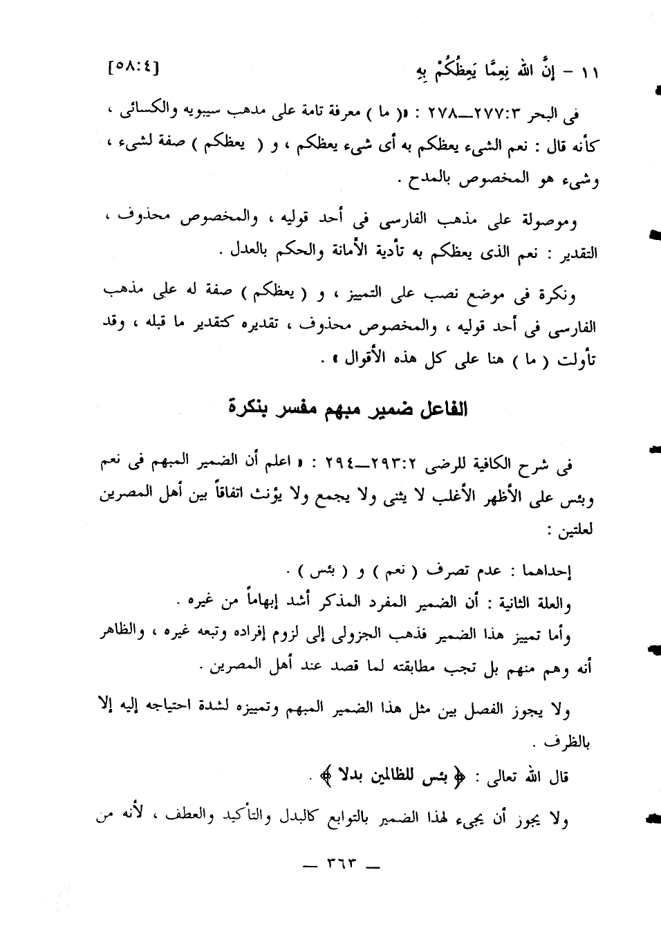في البحر 277:2 - 278: «(ما) معرفة تامة على مذهب سيبويه والكسائي كأنه قال: نعم الشيء يعظكم به أي شيء يعظكم، و (يعظكم) صفة لشيء، وشيء هو المخصوص بالمدح.