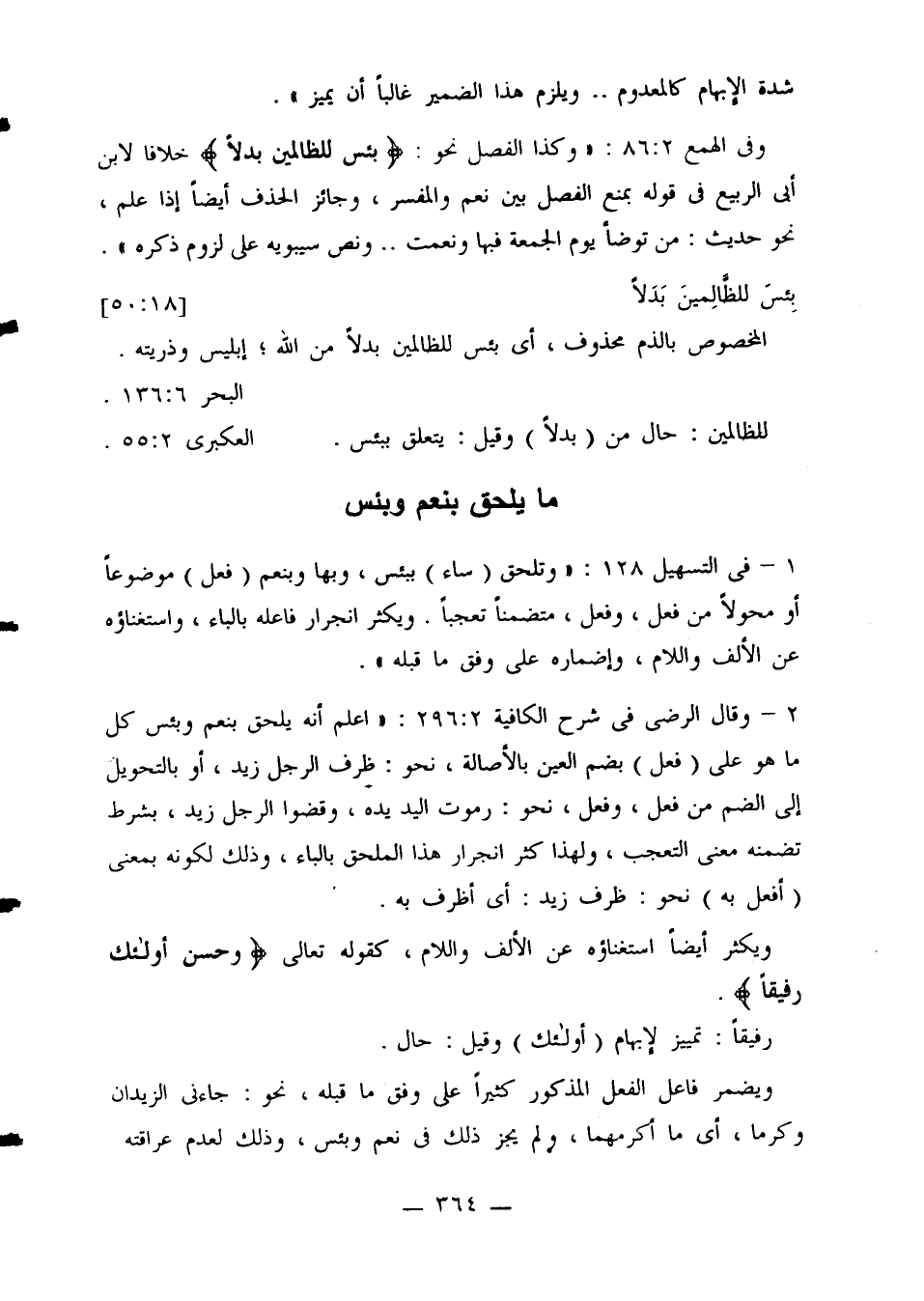 1 - في التسهيل 128: «وتلحق (ساء) ببئس، وبها وبنعم (فعل) موضوعًا أو محولاً من فعل، وفعل، متضمنًا تعجبًا. ويكثر انجرار فاعله بالباء، واستغناؤه عن الألف واللام، وإضماره على وفق ما قبله».
