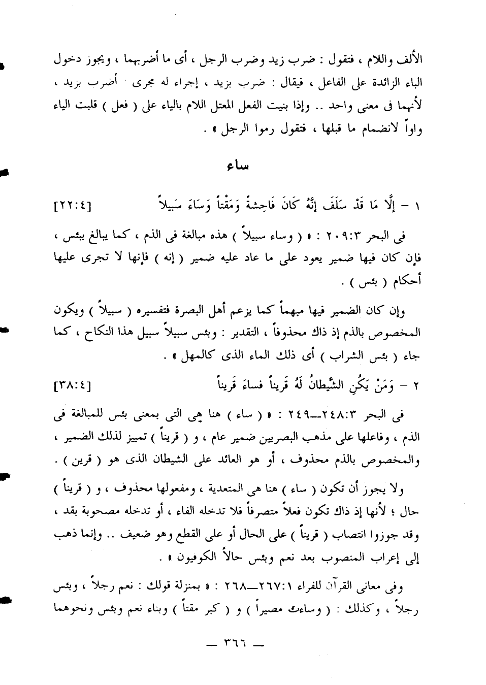 في البحر 248:3 - 239: «(ساء) هنا هي التي بمعنى بئس للمبالغة في الذم، وفاعلها على مذهب القصريين ضمير عام، و (قرينًا) تمييز لذلك الضمير، والمخصوص بالذم محذوف، أو هو العائد على الشيطان الذي هو (قرين).