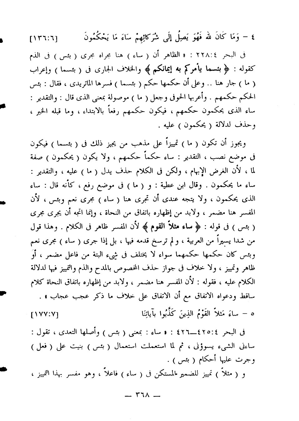 ويجوز أن تكون (ما) تميزًا على مذهب من يجيز ذلك في (بئسما) فيكون في موضع نصب، التقدير: ساء حكمًا حكمهم، ولا يكون (يحكمون) صفة لما، لأن الغرض الإبهام، ولكن في الكلام حذف يدل (ما) عليه، والتقدير: ساء ما يحكمون. وقال ابن عطية: و (ما) في موضع رفع، كأنه قال: ساء الذي يحكمون، ولا يتجه عندي أن تجري هنا (_ساء) مجرى نعم وبئس، لأن المفسر هنا مضمر، ولابد من إظهاره باتفاق من النحاة، وإنما اتجه أن يجري مجرى (بئس) في قوله: {ساء مثلاً القوم} لأن المفسر ظاهر في الكلام. وهذا قول من شدا يسيرًا من العربية، ولم ترسخ قدمه فيها، بل إذا جرى (ساء) مجرى نعم وبئس كان حكمها حكمهما سواء لا يختلف في شيء البتة من فاعل مضمر، أو ظاهر وتمييز، ولا خلاف في جواز حذف المخصوص بالمدح والذم والتمييز فيها لدلالة الكلام عليه، فقوله: لأن المفسر هنا مضمر، ولابد من إظهاره باتفاق النحاة كلام ساقط ودعواه الاتفاق مع أن الاتفاق على خلاف ما ذكر عجب عجاب»