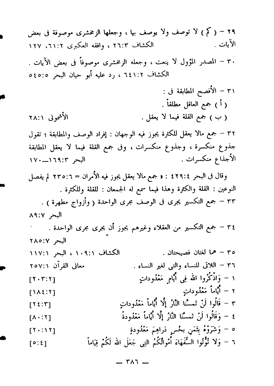 29 - (كم) لا توصل ولا يوصف بها، وجعلها الزمخشري موصوفة في بعض الآيات. الكشاف 26:3، وافقه العكبري 61:2، 127