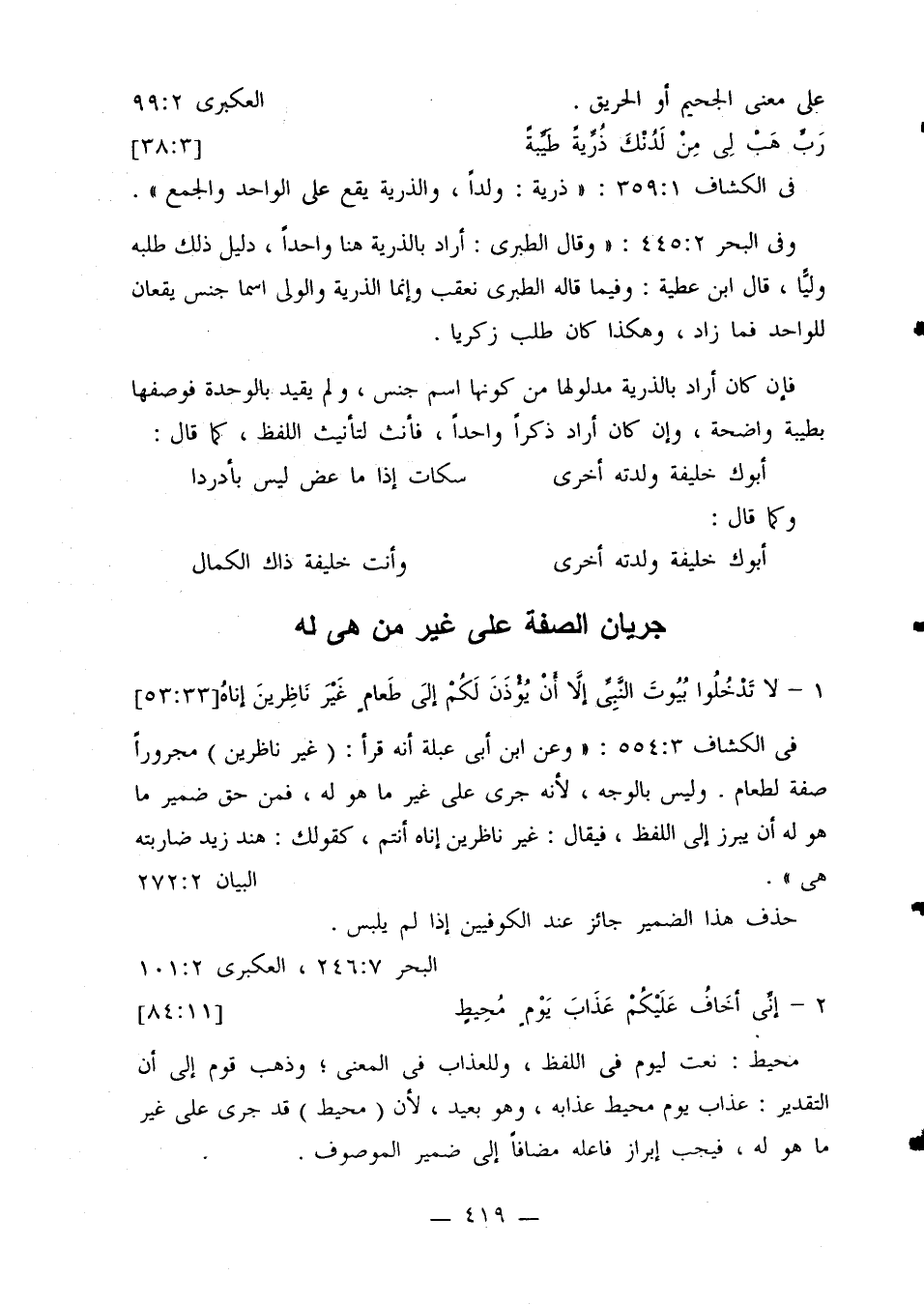 في الكشاف 554:3: «وعن ابن أبي عبلة أنه قرأ: غير ناظرين) مجرورًا صفة لطعام. وليس بالوجه، لنه جرى على غير ما هو له، فمن حق ضمير ما هو له أن يبرز إلى اللفظ، فيقال: غير ناظرين إناه أنتم، كقولك: هند زيد ضاربته هي».
