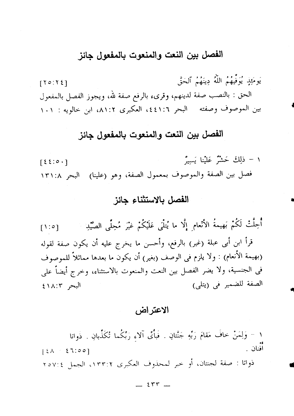 قرأ ابن أبي عبلة (غير) بالرفع، وأحسن ما يخرج عليه أن يكون صفة لقوله (بهيمة الأنعام): ولا يلزم في الوصف (بغير) أن يكون ما بعدها مماثلاً للموصوف في الجنسية، ولا يضر الفصل بين النعت والمنعوت بالاستثناء، وخرج أيضًا على الصفة في (يتلى). البحر 418:3