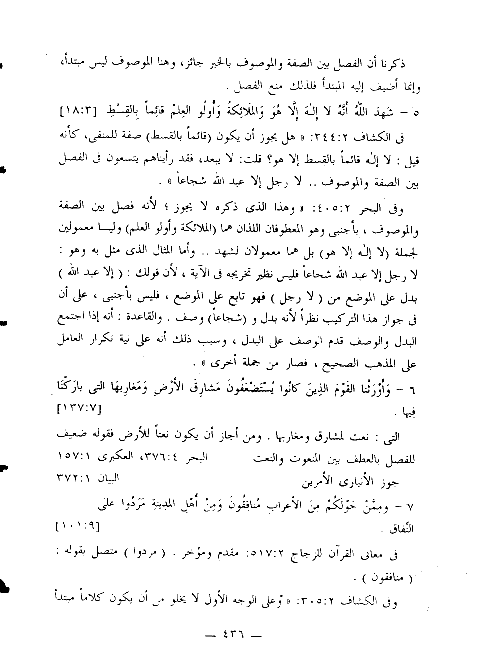 في الكشاف 344:2: «هل يجوز أن يكون (قائمًا بالقسط) صفة للمنفي، كأنه قيل: لا إله قائمًا بالقسط إلا هو؟ قلت: لا يبعد، فقد رأيناهم يتسعون في الفصل بين الصفة والموصوف .. لا رجل إلا عبد الله شجاعًا».