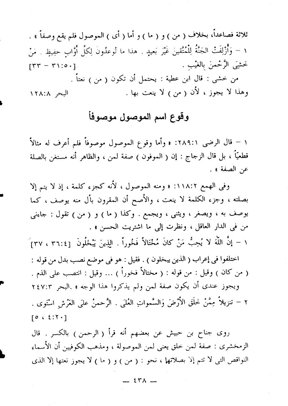 1 - قال الرضي 289:1: «وأما وقوع الموصول موصوفاً فلم أعرف له مثالاً قطعياً، بل قال الزجاج: إن (الموفون) صفة لمن، والظاهر أنه مستغن بالصلة عن الصفة».