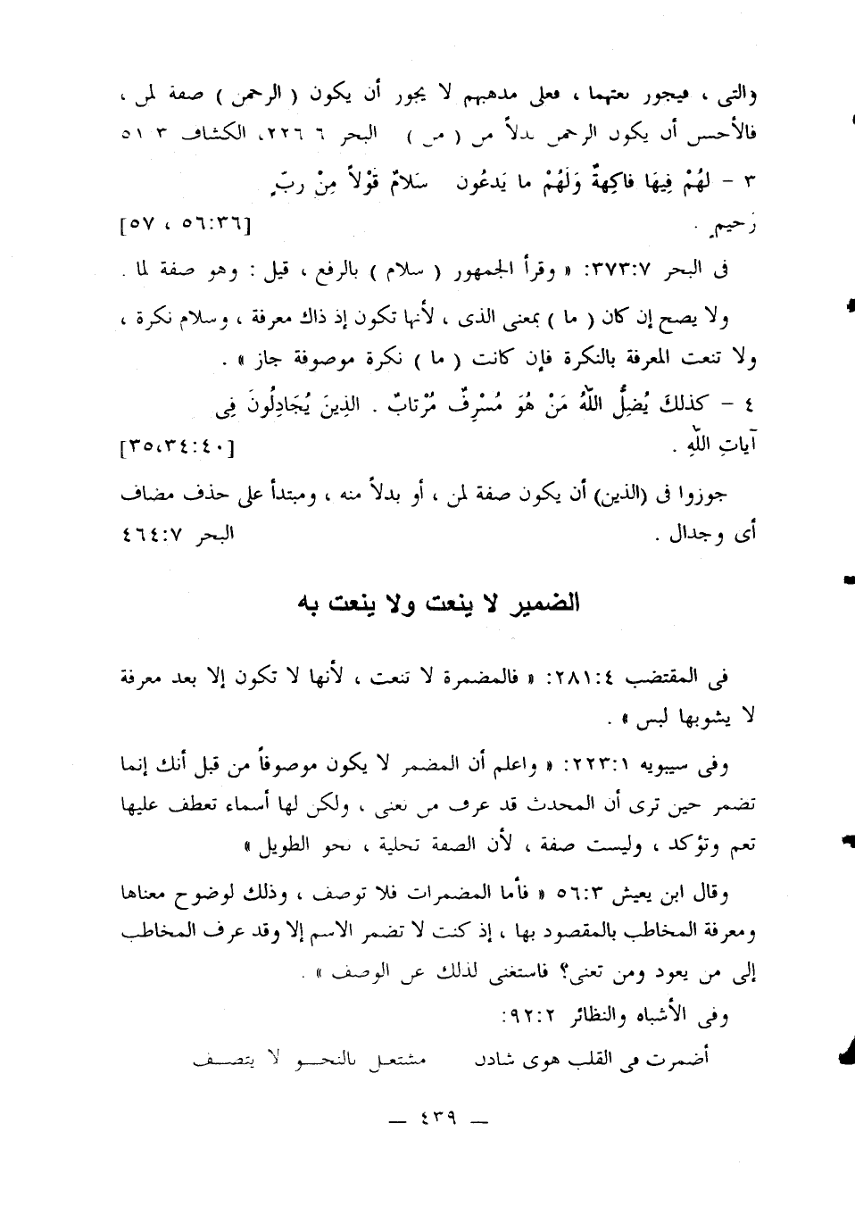 في المقتضب 281:4: «فالمضمرة لا تنعت، لأنها لا تكون إلا بعد معرفة لا يشوبها لبس».