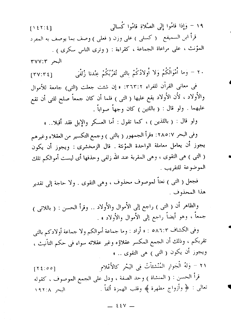 وفي الكشاف 586:3: «أراد: وما جماعة أموالكم ولا جماعة أولادكم بالتي تقربكم، وذلك أن الجمع المكسر عقلاؤه وغير عقلائه سواء في حكم التأنيث، ويجوز أن يكون (التي) هي التقوى ..»