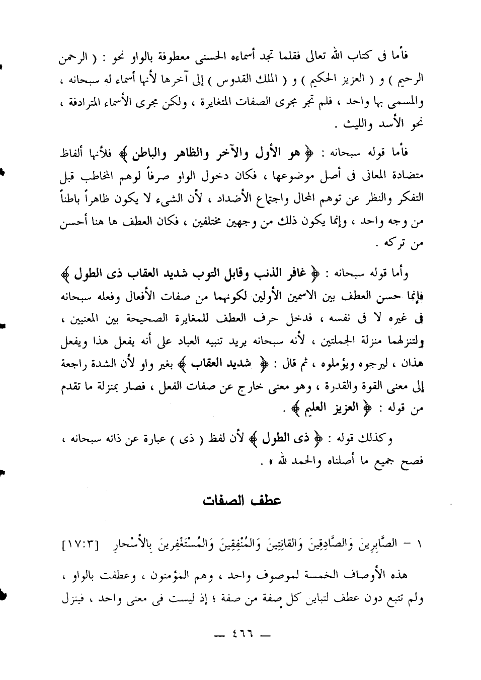 فأما في كتاب الله تعالى فقلما تجد أسماءه الحسنى معطوفاً بالواو نحو: (الرحمن الرحيم) و (العزيز الحكيم) والملك القدوس) إلى آخرها لأنها أسماء له سبحانه، والمسمى بها واحد، فلم تجر مجرى الصفات المتغايرة، ولكن مجرى الأسماء المترادفة، نحو الأسد والليث.