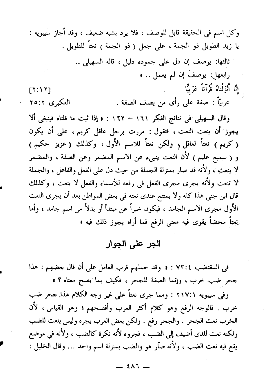 وفي سيبويه 217:1: «ومما جرى نعتًا على غير وجه الكلام هذا جحر ضب خرب. فالوجه الرفع وهو كلام أكثر العرب وأفصحهم؛ وهو القياس، لأن الخرب نعت الجحر. والجحر رفع. ولكن بعض العرب يجره وليس بنعت للضب ولكنه نعت للذي أضيف إلى الضب، فجروه لأنه نكرة كالضب، ولأنه في موضع يقع فيه نعت الضب، ولأنه صار هو والضب بمنزلة اسم واحد ... وقال الخليل: