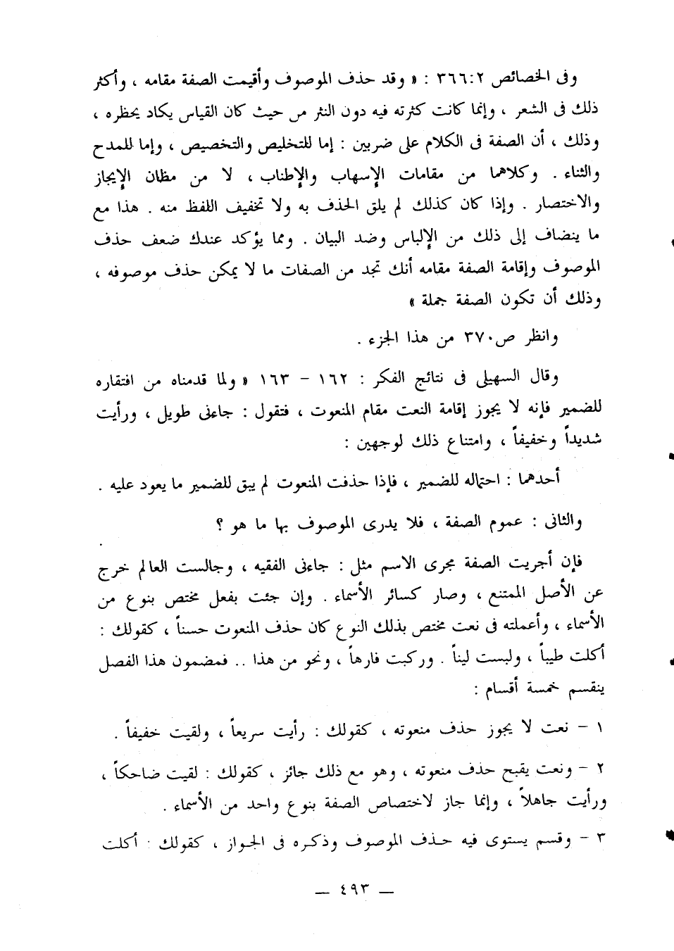 وفي الخصائص 366:2: «وقد حذف الموصوف وأقيمت الصفة مقامه، وأكثر ذلك في الشعر، وإنما كانت كثرته فيه دون النثر من حيث كان القياس يكاد يحظره، وذلك، أن الصفة في الكلام على ضربين: إما للتلخيص والتخصيص، وإما للمدح والثناء. وكلاهما من مقامات الإسهاب والإطناب، لا من مظان الإيجاز والاختصار. وإذا كان كذلك لم يلق الحذف به ولا تخفيف اللفظ منه. هذا مع ما ينضاف إلى ذلك من الإلباس وضد البيان. ومما يؤكد عندك ضعف حذف الموصوف وإقامة الصفة مقامه أنك تجد من الصفات ما لا يمكن حذف موصوفه، وذلك أن تكون الصفة جملة».