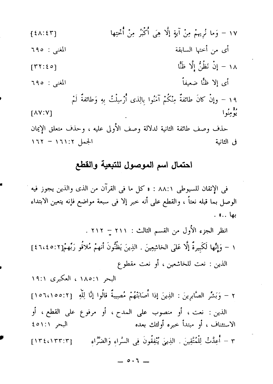 في الإتقان للسيوطي 88:1: «كل ما في القرآن من الذي والذين يجوز فيه الوصل بما قبله نعتاً، والقطع على أنه خبر إلا في سبعة مواضع فإنه يتعين الابتداء بها ..».