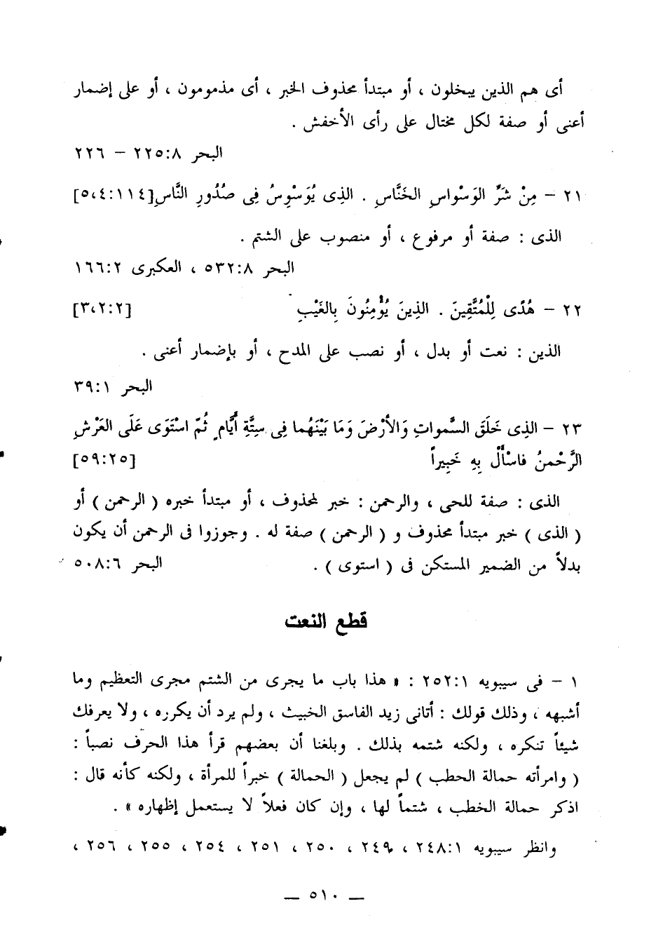 1 - في سيبويه 252:1: «هذا باب ما يجري من الشتم مجرى التعظيم وما أشبهه، وذلك قولك: أتاني زيد الفاسق الخبيث، ولم يرد أن يكرره، ولا يعرفك شيئاً تنكره، ولكنه شتمه بذلك. وبلغنا أن بعضهم قرأ هذا الحرف نصباً: (وامرأته حمالة الحطب) لم يجعل (الحمالة) خبراً للمرأة، ولكنه كأنه قال: اذكر حمالة الحطب، شتماً لها، وإن كان فعلاً لا يستعمل إظهاره».