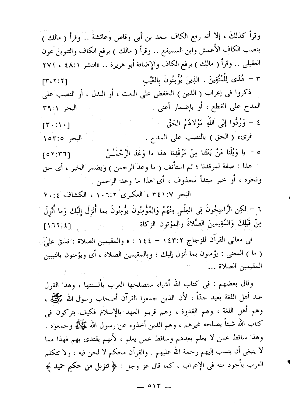 وقال بعضهم: في كتاب الله أشياء ستصلحها العرب بألسنتها، وهذا القول عند أهل اللغة بعيد جداً، لأن الذين جمعوا القرآن أصحاب رسول الله صلى الله عليه وسلم، وهم أهل اللغة، وهو القدوة، وهم قريبو العهد بالإسلام فكيف يتركون في كتاب الله شيئاً يصلحه غيرهم، وهم الذين أخذوه عن رسول الله صلى الله عليه وسلم وجمعوه. وهذا ساقط عمن لا يعلم بعدهم وساقط عمن يعلم، لأنهم يقتدي بهم فهذا مما لا ينبغي أن ينسب إليهم رحمة الله عليهم. والقرآن محكم لا لحن فيه، ولا تتكلم العرب بأجود منه في الإعراب، كما قال عز وجل: {تنزيل من حكيم حميد}