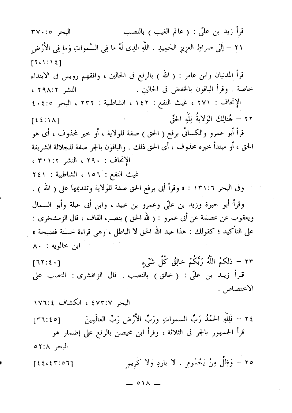 وفي البحر 131:6: «وقرأ أبي برفع الحق صفة للولاية وتقديمها على (الله).