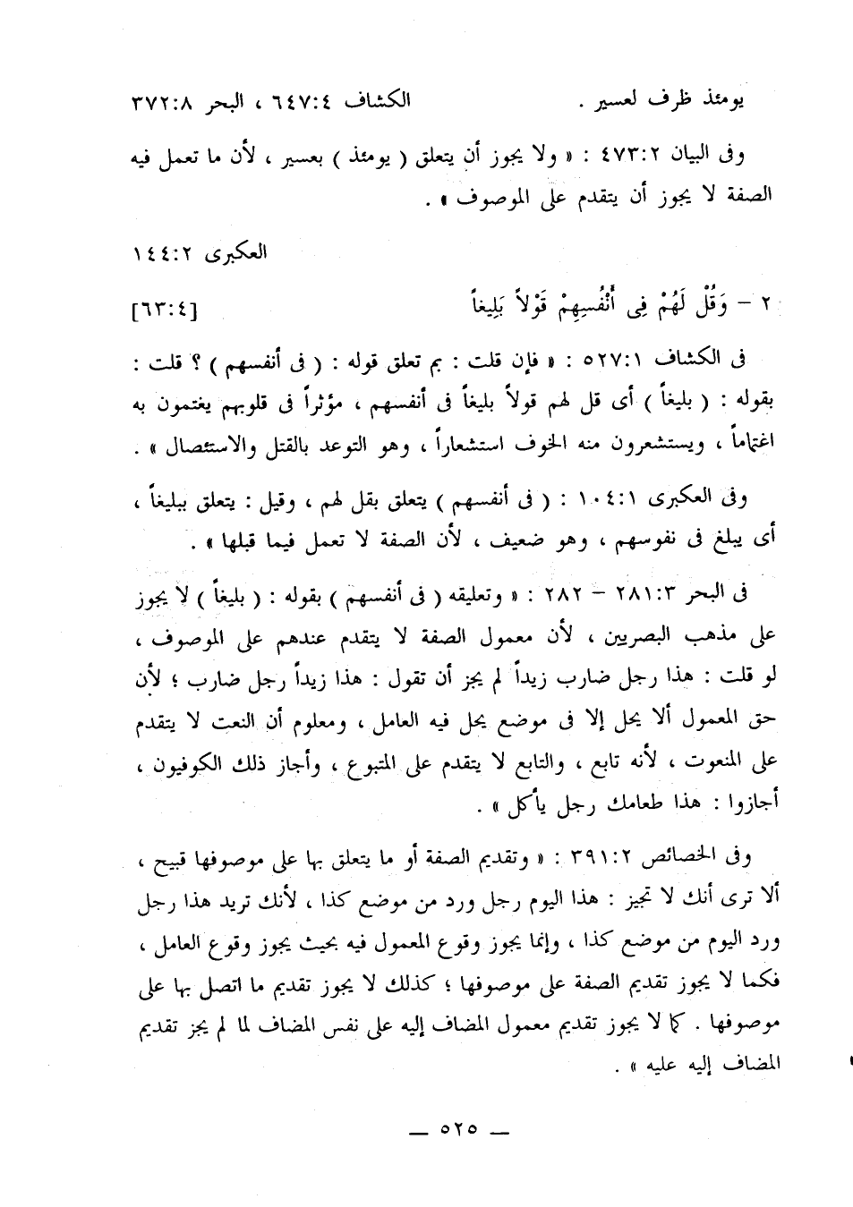 في البحر 281:3 - 282: «وتعليقه (في أنفسهم) بقوله: (بليغًا) لا يجوز على مذهب البصريين، لأن معمول الصفة لا يتقدم عندهم على الموصوف، لو قلت: هذا رجل ضارب زيدًا لم يجز أن تقول: هذا زيدًا رجل ضارب؛ لأن حق المعمول ألا يحل إلا في موضع يحل فيه العامل، ومعلوم أن النعت لا يتقدم على المنعوت، لأنه تابع، والتابع لا يتقدم على المتبوع، وأجاز ذلك الكوفيون، أجازوا: هذا طعامك رجل يأكل».
