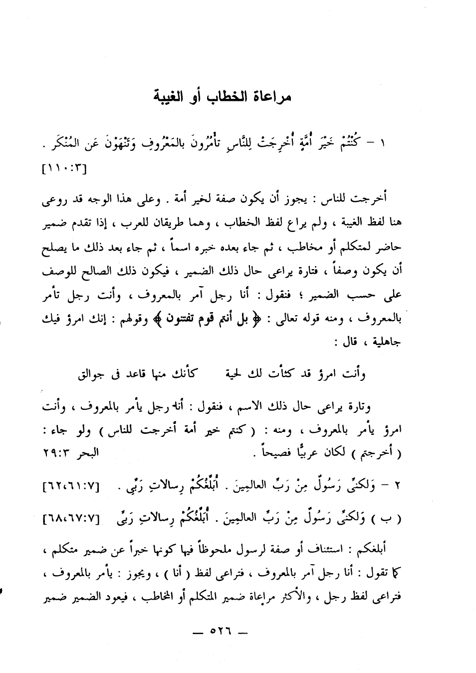 وتارة يراعى حال ذلك الاسم، فنقول: أنا رجل يأمر بالمعروف، وأنت امرؤ يأمر بالمعروف، ومنه: (كنتم خير أمة أخرجت للناس) ولو جاء: (أخرجتم) لكان عربيًا فصيحًا. البحر 29:3