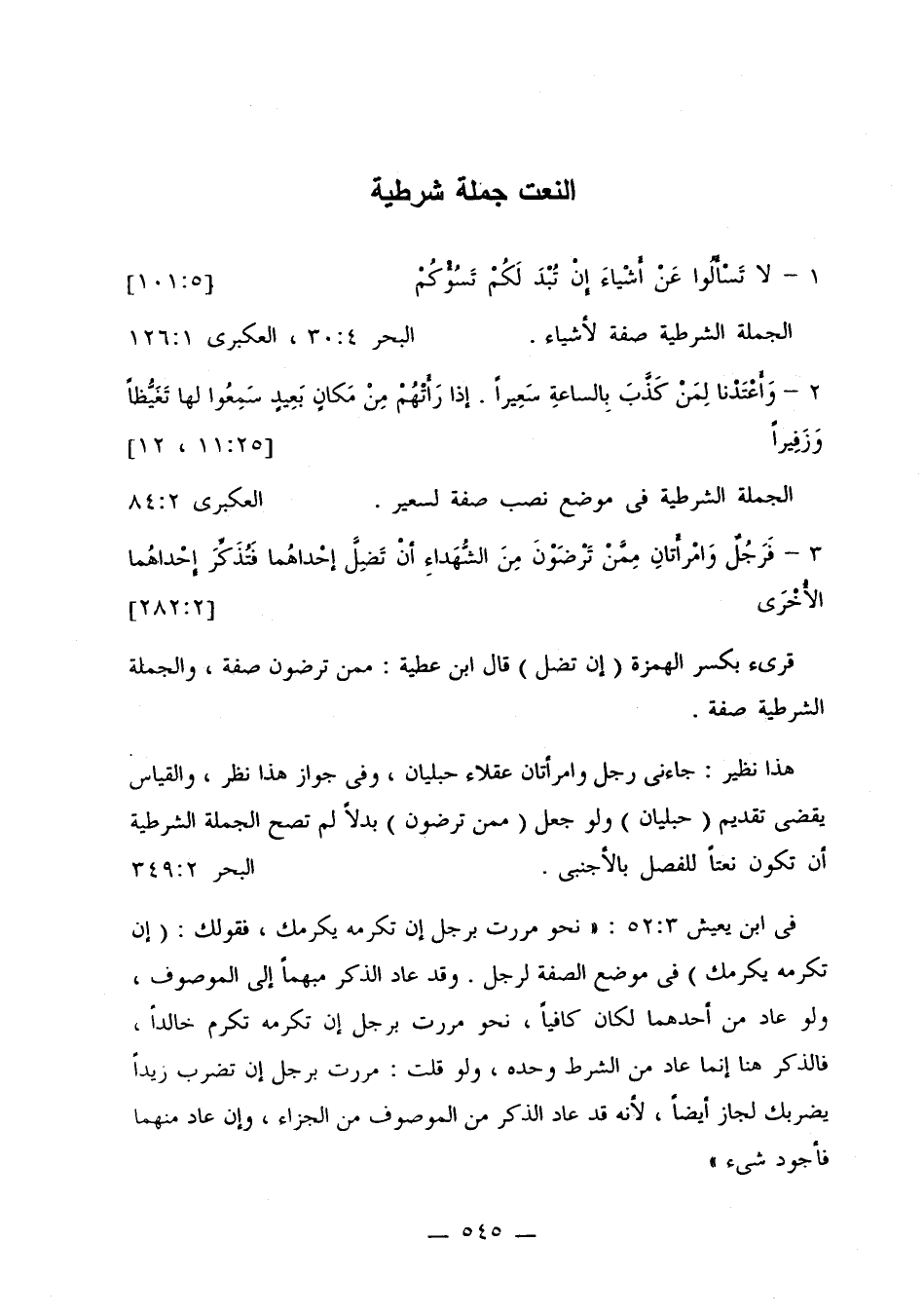 في ابن يعيش 52:3: «نحو مررت برجل إن تكرمه يكرمك، فقولك: (إن تكرمه يكرمك) في موضع الصفة لرجل. وقد عاد الذكر مبهمًا إلى الموصوف، ولو عاد من أحدهما لكان كافيًا، نحو مررت برجل إن تكرمه تكرم خالدًا، فالذكر هنا إنما عاد من الشرط وحده، ولو قلت: مررت برجل إن تضرب زيدًا يضربك لجاز أيضًا، لأنه قد عاد الذكر من الموصوف من الجزاء، وإن عاد منهما فأجود شيء»